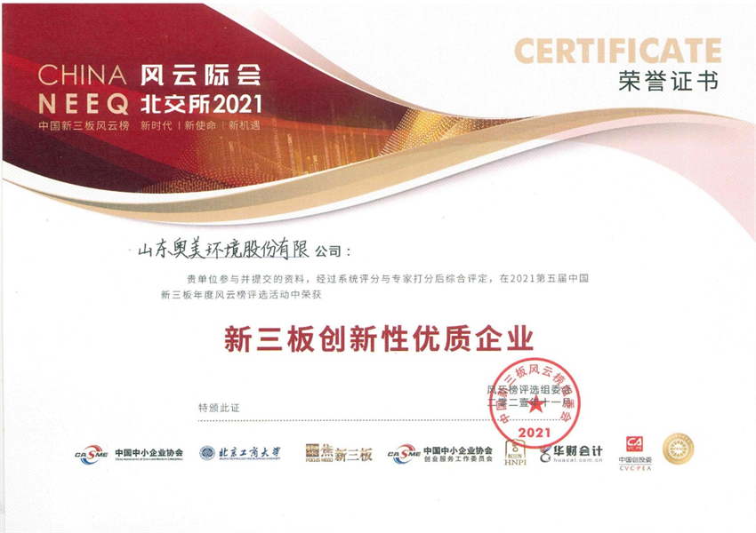 公司在2021年第五屆中國(guó)新三板年度風(fēng)云榜評(píng)選活動(dòng)中,經(jīng)過(guò)系統(tǒng)評(píng)分和組委會(huì)專(zhuān)家打分后綜合評(píng)定后,榮獲新三板創(chuàng)新性?xún)?yōu)質(zhì)企業(yè)。