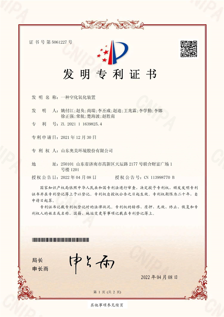 日前,公司又獲得一項(xiàng)發(fā)明專利證書,名稱為“一種空化氧化裝置”,專利號(hào)為ZL2021116398254。